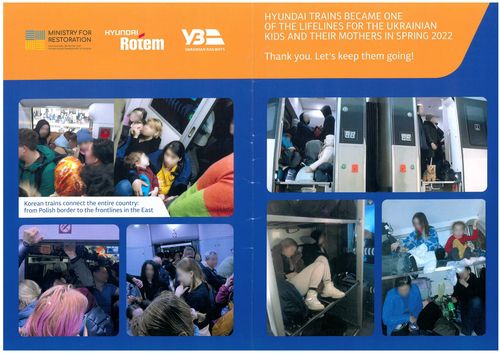 팸플릿 오른쪽 상단에는 "현대로템의 철도차량은 지난해 봄 우크라이나 아이들과 어머니들을 위한 '생명줄' 중 하나가 됐다"며 "감사하다. 앞으로도 계속 부탁한다"는 문구가 적혔다.