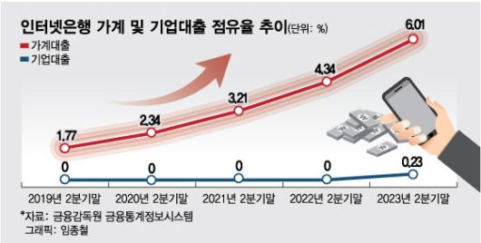 출범 5주년을 맞은 인터넷전문은행의 가계대출 시장 점유율이 빠르게 늘고 있다. 카카오·케이뱅크는 주택담보대출을 중심으로 가계대출을 공격적으로 늘리고 있고, 토스뱅크도 전월세대출을 취급하고 광주은행과의 공동 신용대출 상품 출시를 눈앞에 두고 있다. 다만 미약한 기업대출 분야를 키워 포트폴리오를 다양화할 필요가 있다는 지적도 나온다