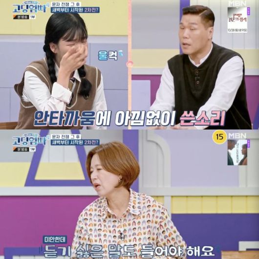 결국 배다은과 전태현은 문자를 통한 부부싸움이 시작됐다. 끝나지 않은 말 전쟁에 서장훈은 “아픈 과거는 우리가 충분히 이해하는데 안타까워서 오늘은 좋게 얘기해야겠다고 했는데 이러면 안 된다”라며 일침을 가했다. 쓴소리에 눈물을 흘리는 배다은이었고, 박미선은 “나는 애쓰고 있는데 주변 사람들은 몰라줘서 속이 상한 거냐”라고 이해하면서도 “듣기 싫은 말도 들을 줄 알아야 한다. 지금 보여지는 것들로는 잘 못된 게 있으니까 혼을 내는 거다. 반성하고 달라지는 모습을 보여달라고 두 사람을 초대한 것”이라고 진심으로 충고했다.