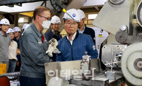 이정식 고용노동부 장관이 18일 오후 서울 영등포구 문래동 소규모 제조업체를 방문해 집중호우 위험요인 관리 상황을 점검하고 있다.(사진=고용노동부 제공) |