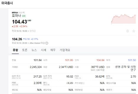 모더나 주가 및 기업 현황 (사진=네이버 증권 갈무리) |