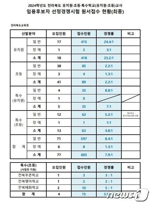 (전주=연합뉴스) 최영수 기자 = 전북교육청은 2024학년도 유치원·초등·특수학교 교사 임용시험의 응시 원서 접수를 마감한 결과 평균 경쟁률이 7.9대 1로 집계됐다고 12일 밝혔다.