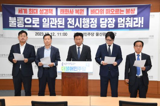 더불어민주당 울산시당은 12일 울산시의회 프레스센터에서 기자회견을 열고 "울산시는 불통으로 일관된 전시행정을 당장 멈춰야 한다"고 촉구했다.