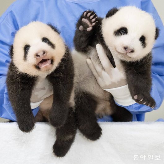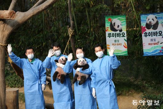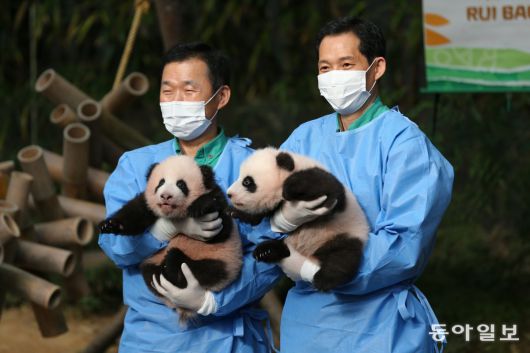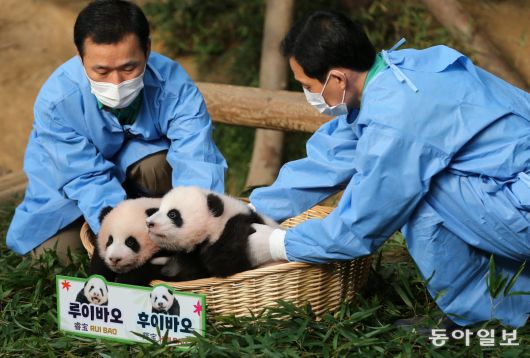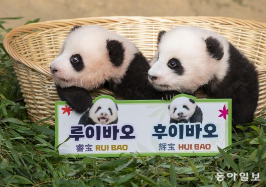 삼성물산 리조트 부문이 운영하는 에버랜드는 이날 판다 월드에서 강철원·송영관 사육사 등 동물원 관계자와 SNS를 통해 사전 초청된 일반인 등이 참석한 가운데 쌍둥이 판다를 언론에 10분간 선보였다. 또 공모를 통해 선정된 쌍둥이 판다의 이름 ‘루이바오’(睿寶), ‘후이바오’(輝寶)도 발표했다. 각각 ‘슬기로운 보물’과 ‘빛나는 보물’이라는 의미다.