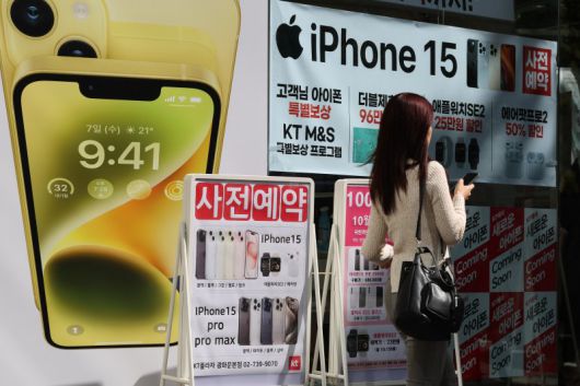 애플의 최신 스마트폰 아이폰15 시리즈의 사전예약 판매를 하루 앞둔 지난 5일 오후 서울의 한 통신사 매장에 사전예약 안내문이 붙어있다. 연합뉴스 |