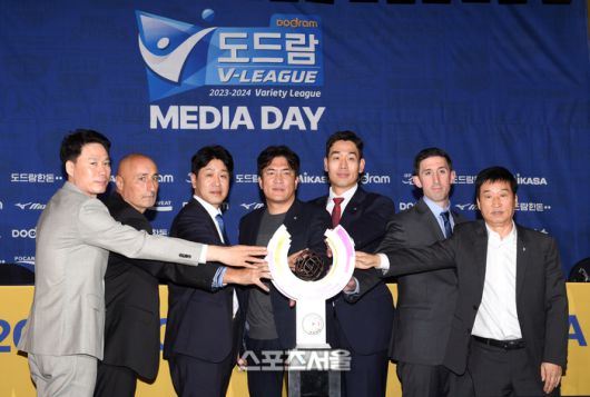 12일 서울 강남구 리베라호텔에서 진행된 도드람 2023-2024 V-리그 여자부 미디어데이 행사에서 각 팀 감독들이 기념촬영을 하고 있다. 왼쪽부터 현대건설 강성형 감독, 흥국생명 아본단자 감독, 한국도로공사 김종민 감독, GS칼텍스 차상현 감독, 정관장 고희진 감독, 페퍼저축은행 조 트린지 감독, IBK기업은행 김호철 감독. 2023. 10. 12. 박진업기자 upandup@sportsseoul.com |