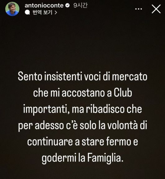 영국 '가디언' 등 유력 매체에서 활동하며 유럽 축구 이적시장에 정통한 파브리시오 로마노 기자는 12일 SNS를 통해 "콘테 감독은 나폴리와 장시간 직접적인 대화를 나눴다. 그는 새로운 기회를 계속 기다리기로 결심했으며 대화는 긍정적이지 않았다. 아우렐리오 데 라우렌티스 나폴리 회장이 콘테 감독과 직접 대화했지만 합의는 이루어지지 않았다"라고 전했다.