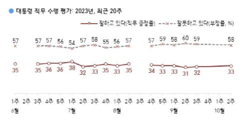 한국갤럽은 지난 10일부터 12일까지 전국 만 18세 이상 1002명을 대상으로 조사(10월 2주)한 결과 윤 대통령의 직무 수행 평가에서 ‘잘하고 있다’고 응답한 비율은 33%를 기록했다. 지난 조사(10월 1주)와 비교해 1%포인트 상승했다.