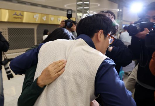 11일 오전 인천국제공항 2터미널 입국장에서 한 아버지가 이스라엘 텔아비브 공항에서 귀국하는 가족을 반기고 있다. [연합] |