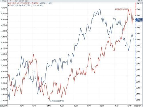 10년물 국채금리(빨강)와 S&P500지수(파랑) 일별 추이 (2023년 1월~현재) |