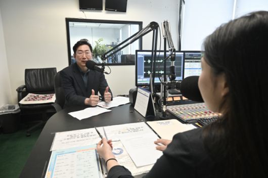 원강수 원주시장이 생방송으로 진행된 뉴욕 라디오코리아와 인터뷰를 하고 있다. 사진|원주시청 |