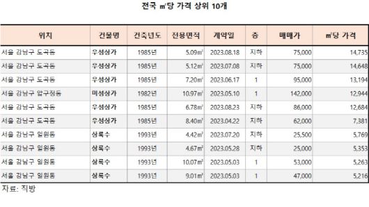 ㎡당 매매가격 상위 10위는 모두 서울 강남구에 위치한 상가로 조사됐다.
