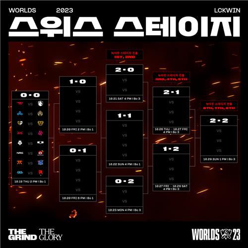 롤드컵 스위스 스테이지는 이달 19일부터 29일까지 서울 강서구 KBS 아레나에서 열린다. 승리한 팀은 승리 팀끼리, 한 번 이상 패배한 팀은 같은 전적의 패배 팀끼리 맞붙어 총 3승을 달성한 팀이 다음 달 2일부터 열리는 8강전에 진출한다.