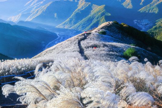 민둥산 억세 물결 '환상적'1시간 30분~2시간 경사진 민둥산을 올라 정상에 다다르니, 서너갈래 고원 산책길엔 빨-노-파 등산복을 입을 여행자의 행렬이 산책하고 주변은 온통 은빛으로 출렁이면서, 환상적인 채도 대비 풍경화를 만들어낸다.