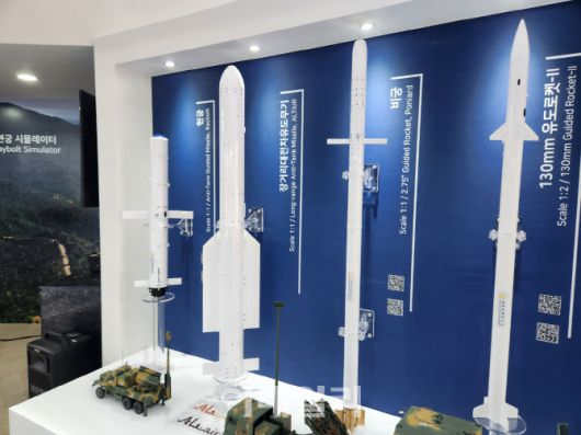 LIG넥스원이 16일 서울국제항공우주 및 방위산업 전시회(ADEX 2023) 미디어데이에서 ‘비궁’ 등 유도무기체계를 전시하고 있다. |