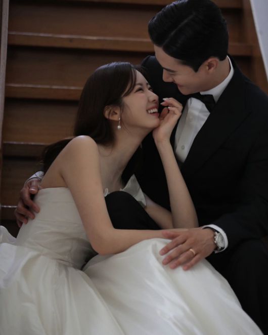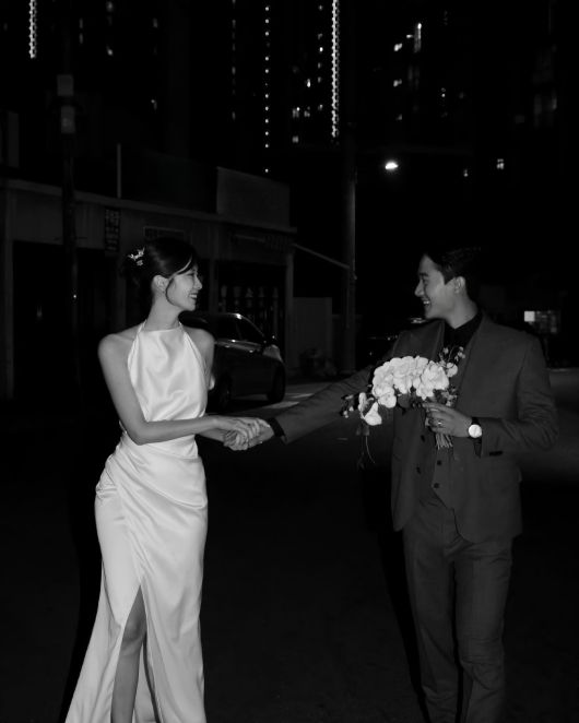공개한 웨딩화보에서 김하윤은 순백의 웨딩드레스를 입고 미모를 자랑했다. 훈남 신랑과 미소를 지으며 포즈를 취하고 있다.