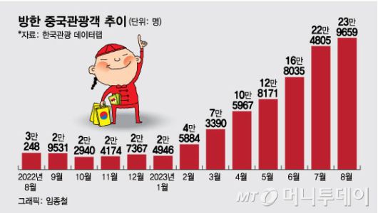 통상적으로 여행 비수기인 지난달에도 중국인 관광객 증가 추세는 이어졌을 것이란 분석이다. 정부가 중국인의 국내 관광 활성화를 위해 올해 말까지 한시적으로 중국인 단체관광객 전자비자 발급 수수료(1만8000원 상당)를 면제키로 한 데다 중국 국경절 연휴(9월29일~10월6일) 등 긍정적 요인이 있었기 때문이다.