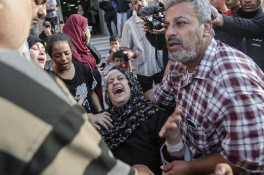 팔레스타인 무장정파 하마스와 이스라엘 간 교전 열흘째인 17일 가자지구 남부 칸 유니스의 나세르 병원에서 이스라엘의 공습으로 숨진 시신을 본 유가족이 슬퍼하고 있다. 칸 유니스=EPA 연합뉴스 |