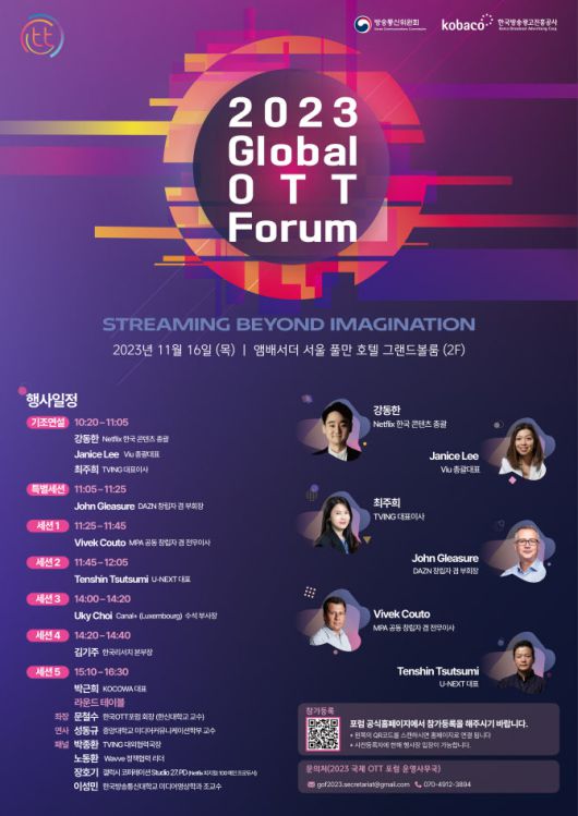 총 5개 세션으로 구성된 이번 포럼은 글로벌 OTT 1위인 넷플릭스의 강동한 한국콘텐츠총괄과 동남아시아 최대 OTT로 자리매김한 홍콩 Viu의 제니스 리 대표, 국내 토종 OTT 1위인 티빙(TVING)의 최주희 대표가 각각 글로벌 OTT 시장 및 아시아 OTT 시장 발전방안과 온라인스트리밍의 미래에 대해 기조연설을 한다.