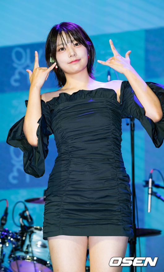 [OSEN=민경훈 기자] 18일 오후 서울 마포구 서교동 무신사 개러지에서 걸그룹 QWER(큐더블유이알 - 쵸단, 마젠타, 히나, 시연)의 싱글 1집 ‘Harmony from Discord’(하모니 프롬 디스코드) 데뷔 쇼케이스가 열렸다. QWER 시연이 무대 위에서 포토타임을 갖고 있다. 2023.10.18 / rumi@osen.co.kr