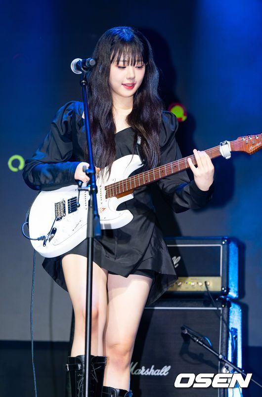 [OSEN=민경훈 기자] 18일 오후 서울 마포구 서교동 무신사 개러지에서 걸그룹 QWER(큐더블유이알 - 쵸단, 마젠타, 히나, 시연)의 싱글 1집 ‘Harmony from Discord’(하모니 프롬 디스코드) 데뷔 쇼케이스가 열렸다. QWER 히나가 화려한 무대를 선보이고 있다. 2023.10.18 / rumi@osen.co.kr