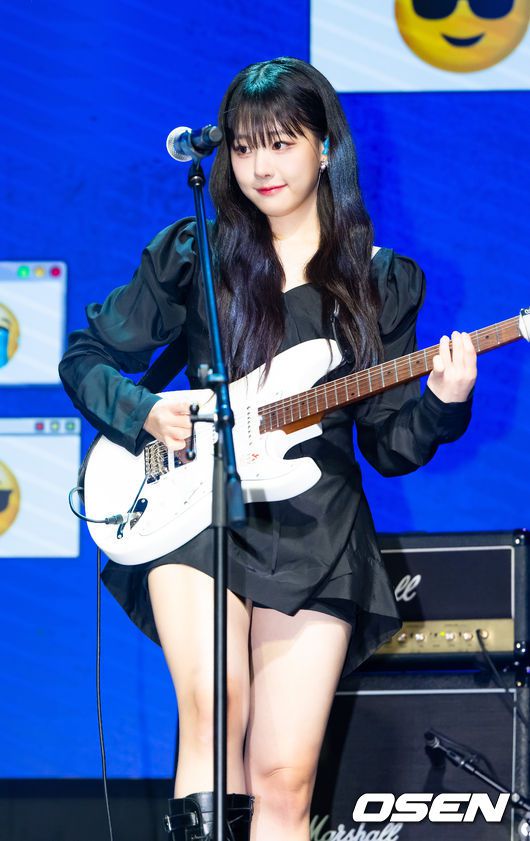 [OSEN=민경훈 기자] 18일 오후 서울 마포구 서교동 무신사 개러지에서 걸그룹 QWER(큐더블유이알 - 쵸단, 마젠타, 히나, 시연)의 싱글 1집 ‘Harmony from Discord’(하모니 프롬 디스코드) 데뷔 쇼케이스가 열렸다. QWER 히나가 화려한 무대를 선보이고 있다. 2023.10.18 / rumi@osen.co.kr