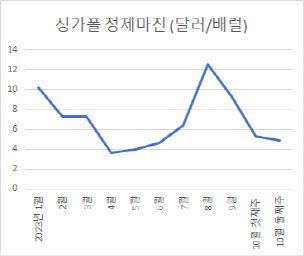 하지만 최근 들어 정제마진이 하락세를 나타내고 있다. 10월 둘째주 싱가폴 정제마진은 배럴당 4.9달러로 9월 평균(9.3달러)대비 반토막이 됐다.