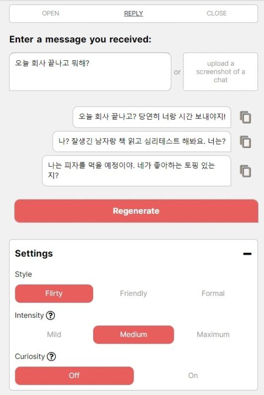'오늘 회사 끝나고 뭐해?'라는 질문과 함께 어조와 길이를 선택하면 '바람 쐬러 가려고', '밖에서 산책할까 생각 중', '밥 먹으러 가자' 등의 답변을 생성해주는 방식이다. 원하는 대답이 나올 때까지 새 답변을 생성하도록 요청할 수도 있다. 다만 구독 플랜에 따라 생성 횟수는 제한된다.