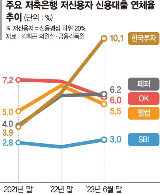 18일 국회 정무위원회 소속 김희곤 국민의힘 의원이 금융감독원에서 제출받은 자료에 따르면 총자산 상위 5개 저축은행(SBI·OK·웰컴·페퍼·한국투자)의 올해 상반기 저신용자(신용점수 하위 20%) 대출 신규 취급액은 총 1조3947억원으로 집계됐다. 2022년 연간 신규 취급액(4조1901억원)의 33.3%이다. 2021년 취급액(5조9126억원) 기준으로는 23.6%에 그쳤다. 하반기 저축은행 영업여건이 나아지지 않은 점을 고려하면 작년 수준을 밑돌 것으로 예상된다.