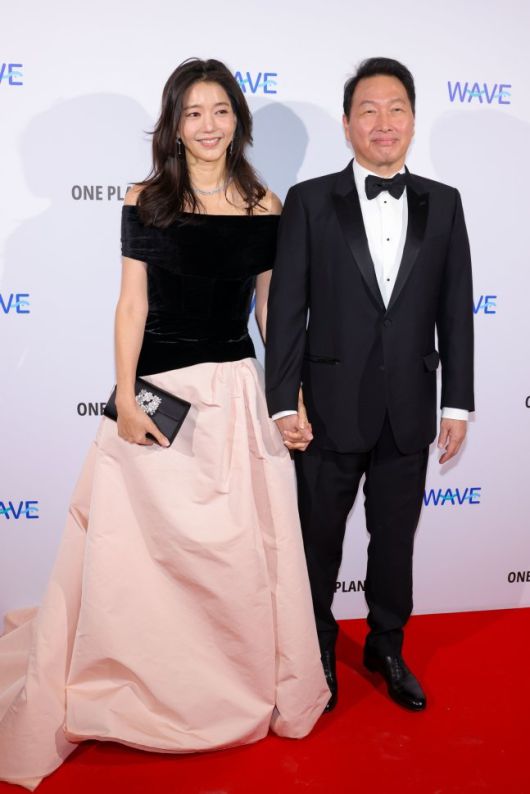 최태원 SK그룹 회장(오른쪽)과 동거인 김희영 티앤씨재단 이사장이 14일(현지 시간) 프랑스 파리에서 열린 공식행사에서 찍힌 사진이 뒤늦게 공개됐다. 루이비통 주최로 국제박람회기구(BIE) 회원국 대표들을 초청한 디너 행사로, 반기문 전 유엔 사무총장과 카를라 브루니 전 프랑스 대통령 부인 등 국내외 유명 인사들이 참석했다. 최 회장과 김 이사장이 공식석상에서 함께 찍은 사진이 공개된 것은 이번이 처음이다.
