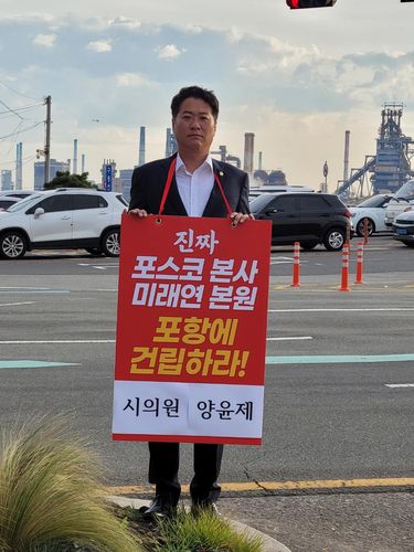 양윤제·함정호 시의원은 19일 오전 포항 형산교차로와 포항의 포스코홀딩스 본사 앞에서 출근하는 포스코 임직원을 향해 "진짜 포스코 본사와 미래기술연구원 본원 포항에 건립하라"고 쓴 팻말을 목에 걸고 1인 시위를 했다.