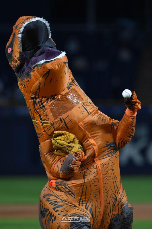 NC 다이노스의 팬인 '공룡좌'가 19일 창원 NC파크에서 열리는 NC 다이노스와 두산 베어스의 와일드카드 결정전 1차전에 앞서 시구를 하고 있다. 2023. 10. 19. 창원 | 박진업기자 upandup@sportsseoul.com [기사제보 news@sportsseoul.com] Copyright ⓒ 스포츠서울&sportsseoul.com
