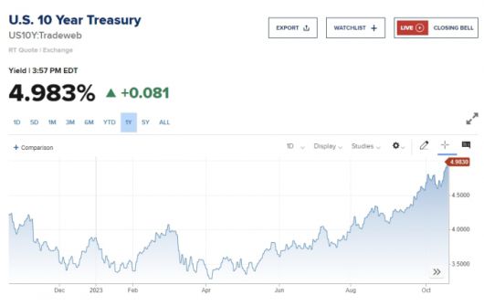 연준 의장이 추가 인상 가능성을 시사하면서 채권수익률은 상승세를 계속했다. 벤치마크 미국채 10년물 수익률은 이날 연중 최고치인 4.996%를 기록했다. 2007년 이후 16년 만에 가장 높은 금리로 5% 돌파가 머잖았다는 지적이다.