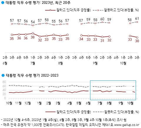 20일 여론조사기관 갤럽의 자체 정례 여론조사(지난 17~19일 전국 만 18세 이상 성인남녀 1000명을 대상으로 전화조사원 인터뷰 방식으로 진행)에 따르면 윤 대통령이 현재 직무를 '잘하고 있다'는 응답률이 30%, '잘못하고 있다'는 부정 응답률은 61%로 집계됐다. 직전 조사인 10월 2주차 조사보다 긍정평가 비율이 3%포인트 감소하고, 반대로 부정평가 비율은 같은 만큼 올랐다.