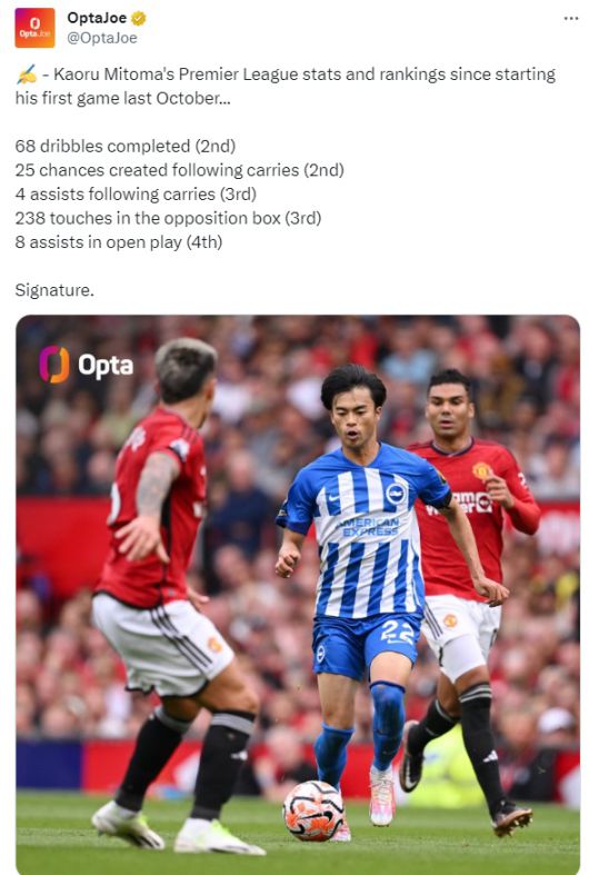 축구통계매체 '옵타(Opta)'는 21일(한국시간) "지난해 10월 첫 경기를 치른 후 미토마 가오루의 프리미미어리그 스탯과 랭킹"이라며 미토마가 지금까지 프리미어리그 무대에서 쌓은 기록을 공개했다.