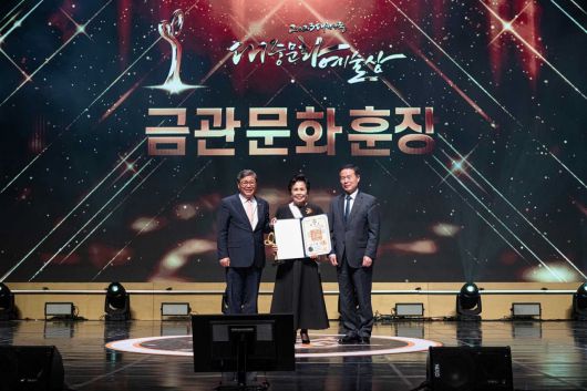 왼쪽부터 문화체육관광부 전병극 제1차관, 금관문화훈장 수훈자 가수 이미자, 콘진원 조현래 원장. |