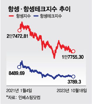 특히 알리바바·텐센트 등 중국 인터넷 기업이 주로 포함된 항셍테크지수는 2021년 기록한 최고치 대비 3분의 1토막으로 떨어지는 등 초토화됐다. 국내에서도 홍콩 항셍테크지수를 추종하는 상장지수펀드(ETF)를 매수한 투자자가 적잖게 있지만, 지금은 끝없는 하락에 자포자기한 상태다.