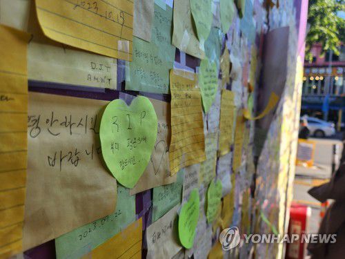 '잊지 않고 기억하겠습니다, 기도할게요. 그곳에서 편히 쉬세요', '부디 하늘에선 편하게 지내시길'과 같은 글귀가 테이프로 단단히 고정된 포스트잇 위에 겹쳐 붙어 있었다.