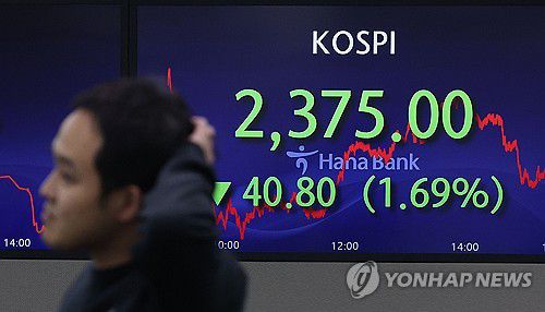 22일 금융투자업계에 따르면 코스피는 지난 20일 2,375.00으로 1주일 전인 지난 13일(2,456.15)보다 3.30% 하락했다.