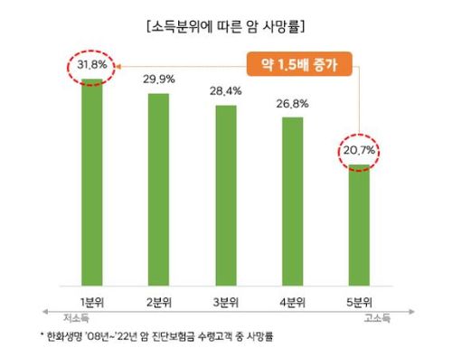 한화생명[088350]은 자사 빅데이터 전문가 그룹인 데이터랩(DataLAB)에서 2008∼2022년 암 보험급 지급고객을 대상으로 소득수준에 따른 사망률을 분석한 결과 이같이 나타났다고 22일 밝혔다.