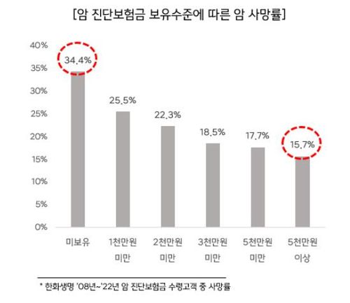 특히 5천만원 이상의 암 진단보험금을 보유하면 소득의 많고 적음에 관계없이 암 사망률은 20% 미만으로 낮게 나타났다.