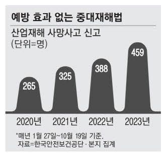 22일 매일경제가 한국산업안전보건공단이 전국 작업장으로부터 신고받아 게시하는 사고성 사망사고 속보를 전수 집계한 결과, 사망 신고는 중대법 시행 이후 2년 연속 증가한 것으로 나타났다. 공단 홈페이지에 따르면 중대법이 시행된 지난해 1월 27일부터 같은 해 10월 19일까지 사망자는 388명(부상 53명)으로 나타났다. 그러나 올해 1월 27일부터 지난 19일까지 신고된 사망자 수는 총 459명(부상 35명)으로 지난해 같은 기간보다 18.3% 더 늘었다. 중대법 시행 직전 해인 2021년 사망자 수(325명)와 지난해를 비교해도 사망자 수는 19.4% 증가했다. 이처럼 연도별 사망자 수는 2020년(265명) 이후 매년 증가세를 보이고 있다.
