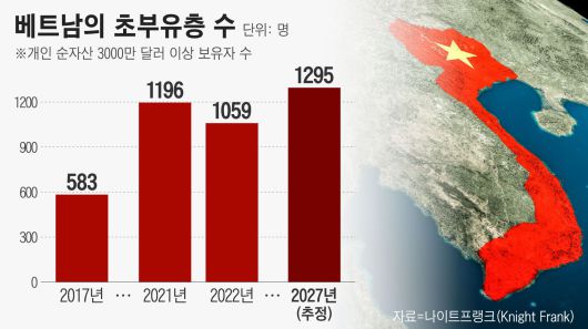 부유층도 늘어나는 추세다. 영국 부동산 컨설팅 회사 나이트프랭크는 100만 달러(약 13억5800만원)의 유동자산을 보유한 베트남 고액 자산가가 지난해 기준 7만2135명이며, 2026년에는 그 수가 59% 이상 증가한 11만4800명에 이를 것으로 내다봤다.