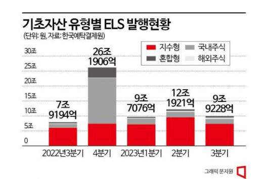 증시 부진이 이어지면서 대표적인 '중위험 중수익' 상품인 주가연계증권(ELS)도 쪼그라들고 있다. 미국 국채가격 상승과 이스라엘과 팔레스타인 무장 정파 하마스 간의 전쟁 등의 영향이다.