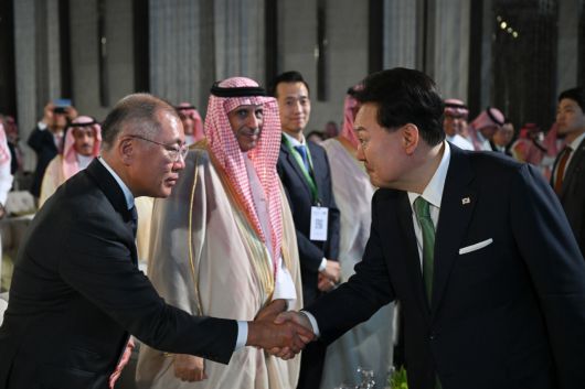 사우디아라비아를 국빈 방문 중인 윤석열(오른쪽) 대통령이 22일(현지시간) 리야드 페어몬트 호텔에서 열린 한·사우디 투자포럼에서 정의선 현대차 그룹 회장과 악수하고 있다. [연합] |