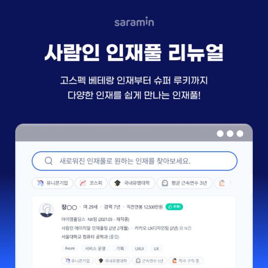 이번 리뉴얼은 인재풀 이용 기업들의 니즈를 반영해 제안의 성공률을 높이는 방향으로 이뤄졌다. 문정순 사람인사업실 실장은 "고스펙자부터 고연봉자, 성장 기업 경험자, 젊은 리더, 높은 성장 가능성을 지닌 루키까지, 기업에 적합한 인재와 빠르고 편리하게 만날 수 있다"고 말했다.