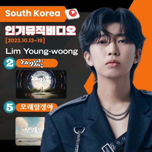 그는 '유튜브 음악 차트 및 통계'에 따르면 42주차(10월 13일 ~ 10월 19일) 국내 유튜브 인기 뮤직비디오 2위는 임영웅의 'Do or Die'와 ' 모래알갱이'가 5위를 기록했다.