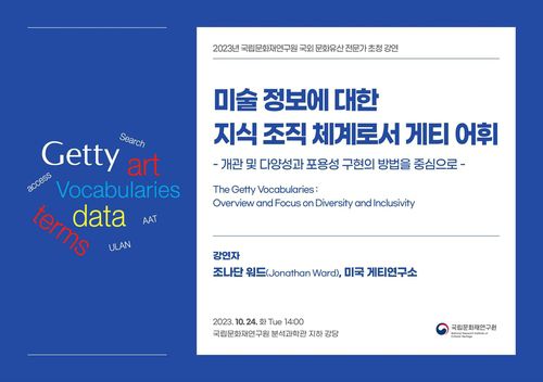 문화재청 국립문화재연구원(원장 김연수, 이하 연구원)은 24일 오후 2시 국립문화재연구원(대전 유성구) 분석과학관 강당에서 디지털 미술사 분야의 세계적 전문가인 미국 게티연구소 편집자를 초빙해 '미술 정보에 대한 지식조직체계(KOS)로서 '게티 어휘': 개관 및 다양성과 포용성 구현의 방법을 중심으로'란 주제의 강연을 개최한다.