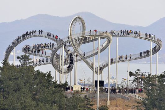 경북 포항시 북구 환호공원. 언덕 위에 자리해 아래로는 영일대 해수욕장이, 멀리 호미곶까지 내려다 보인다. 환호공원은 경치도 경치지만 특별한 체험형 조형물로 인기다. 트랙 길이 333m, 계단 개수 717개로 이뤄진 이 조형물은 언뜻 보면 360도로 돌아가는 롤러코스터처럼 생겼다. 이름은 ‘스페이스워크’. 국내에는 포항밖에 없다.