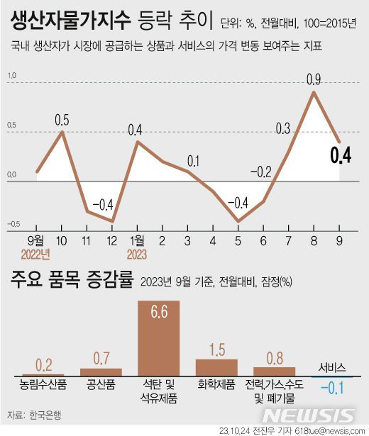 유성욱 한은 경제통계국 물가통계팀장은 "이스라엘과 팔레스타인 무장단체 하마스와의 분쟁 직후 올랐다가 현재는 등락 중"이라면서 "(10월 생산자물가)는 향후 추이를 봐야한다"고 말했다.